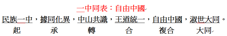 在中華民族的大纛下,兩岸擱置主權爭議,不是誰吃掉誰。只有一個現在進行式、兩岸齊努力,未來經由平等互助、並肩合作而統一,成為自由、民主、均富、廉能的「自由中國」。台灣與大陸都有尚待努力的空間,為此目標競合,共同訂立新憲法,世界上只有「一個中國」,應當就是「自由中國」。