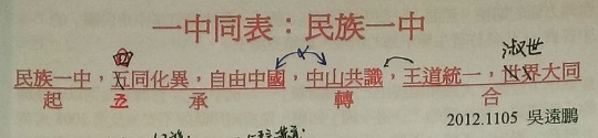 大陸看待台灣問題是民族問題,正因如此,在民族的大纛下,大陸貴乎「以大事小以仁」,對台灣表現謙卑與和睦,台灣則「以小事大以智」,不卑不亢,堅定自信。兩岸擱置主權爭議,同心追求「中華民族可敬復興」,平等互助,並肩攜手,建立自由、民主、廉能、均富的「自由中國」,是為中華民族的「一個中國」,也就是「民族一中」。