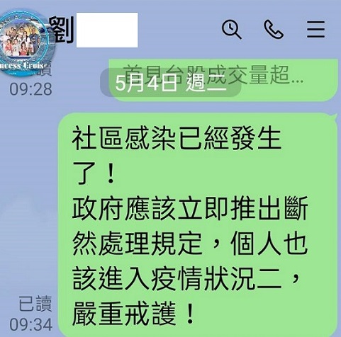 上圖是2021.0504日筆者在LINE社群上提醒諸友「社區感染已經發生」,要主動提升實施第二級警戒,我判斷的依據,是有三名本土確診者的感染源不明。加上對諾富特飯店事件背後的政治判斷,認為此事非同小可,而且已經有相當時日,疫情應已擴散成為社區感染。但政府的處理態度顯然輕忽,匡列也不確實,當時就漏掉一名諾富特飯店叫修的水電工。