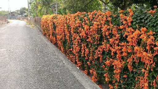 野薑花的高度大約150公分,可以把「中山智慧城」的立面外觀,由每戶大花架的蔓藤植物加上野薑花,以及每兩戶之間垂直矗立的制震景觀柱(如上圖C03),依附在柱體上的蔓藤植物,如下圖爆仗花,構成終年綠葉茂密,春季開花,花色燦爛繁華(筆者攝於屏東縣潮州鎮東側補注湖附近民宅),妝扮成青蔥中也有色彩的的城市山巒。