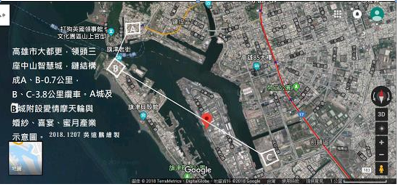 上圖初成於 2018.1207 日凌晨,針對如何成就高雄市的愛情產業鏈而構思,如何命名?不論「婚紗城」、「愛情城」、「自貿城」等,都有其侷限,那就名為「高雄港三山城」,意取高雄港的世界級地標---三座「中山智慧城」。