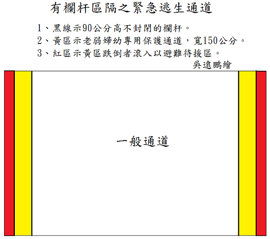 上述老弱婦幼之保護通道,平時就應作區隔使用,使成習慣,萬一發生緊急疏散時,才會習慣成自然,產生保護老弱婦幼的作用,這將形成另一種社會祥和與安全的文化。