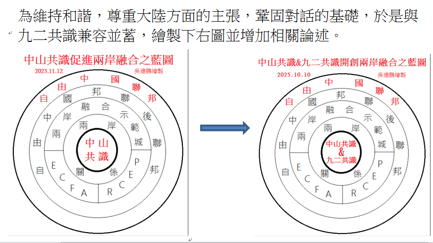 將中山智慧城塑造成民主與經濟融合的有機體,作為施行於大陸的典範,跬步寸累,始於「中山共識促進兩岸融合之藍圖」(如下圖),連同本文所述,允為對策。