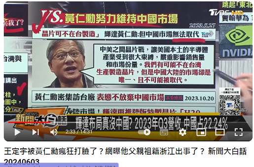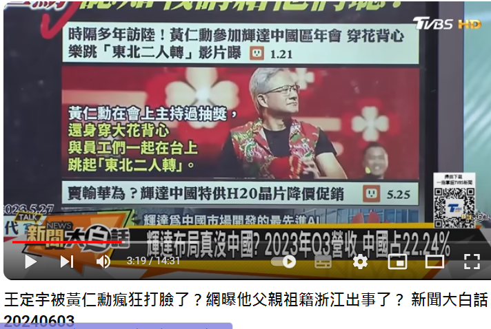 謝社長說黃仁勳「一個9歲離開台灣的孩子那麼愛台灣,你想想,你每天生長在這裏,你怎麼那麼不愛台灣?」其實就在去年五月,黃仁勳還在努力愛大陸,穿著大紅花背心,跟公司同事大跳「東北二人轉」(文末附圖),他是商人,無可厚非。