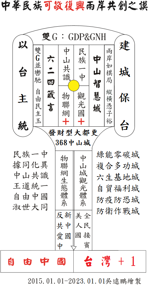 奠基於「中山智慧城」,據以整合經濟、軍事、社會、外交複合發展的「368中山城興台淑世藍圖」(下附第三圖),可以為台灣提供複合多功的平台,促成產業群聚,技術升級,自由開放,民主善治,社會安定,國家安全,加上已經為世所肯定,源自中華文化的誠信(TRUST)文化,建構好這座可供團結與分工合作的平台,是台灣政治清明與經濟成長,可大可久的基礎,也才有條件引領兩岸共榮,受到國際尊敬與歡迎。