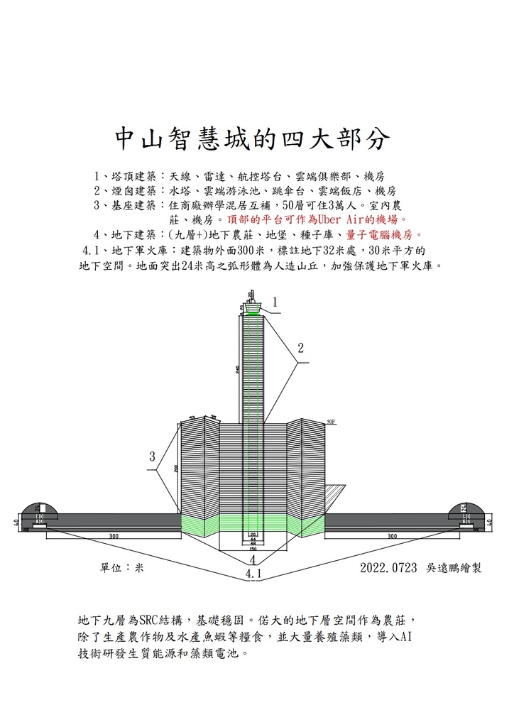 「中山智慧城」是超大型大樓,2.0版基地面積36公頃,主建物佔地8.7公頃,一層的面積21508坪。都會型地上38層地下一律九層,可容居住及商旅人口25012人,由於複合多功所以優點很多,面對台海防衛作戰更是非它不可因而大利多。