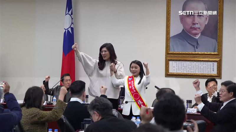 國民黨中常會上張嘉郡被披上彩帶,現場高喊「當選!」國民黨中常會:「張嘉郡張嘉郡張嘉郡,當選!當選!當選!」