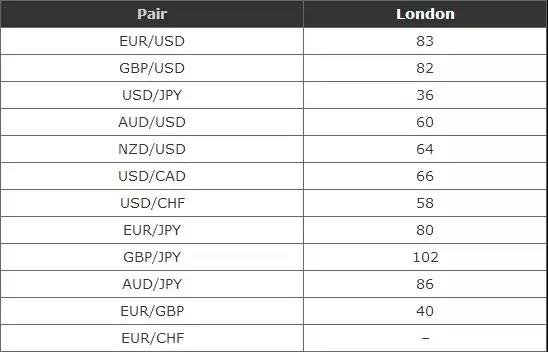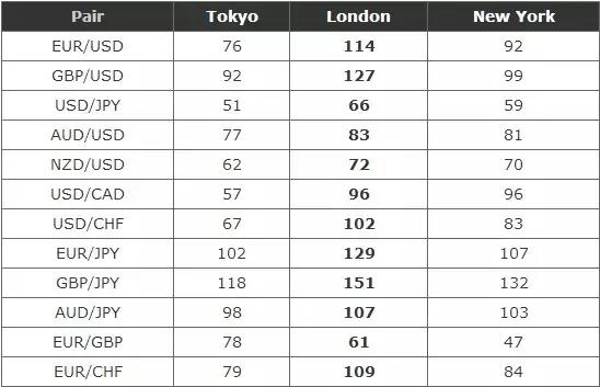 以下是倫敦交易時段主要貨幣對的平均點數波動範圍: