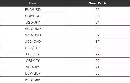 由於歐洲時段市場流動性巨大,該時段幾乎適合任何貨幣對交易。 當然,最理想的交易貨幣對還是歐元/美元、英鎊/美元、美元/日元以及美元/瑞郎,因為這幾個貨幣對的點差最低。 同時,這些貨幣對通常會直接受到歐洲時段市場消息面因素的影響。 你也能夠交易日元貨幣對,通常是歐元/日元和英鎊/日元,因為日元貨幣對在該時段的波動較大。不過,由於它們都是交叉貨幣對,其點差會較大。 下面我們將迎來紐約時段。