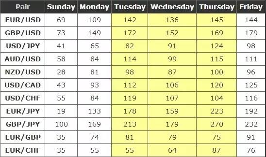 下表是一周以內每一天各主要貨幣對的平均波動點數範圍: