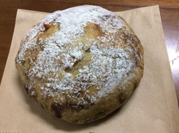 4、再將麵糰輕壓後整型成圓形後放上烤盤,將烤盤整個放在大型箱子中發酵一個半至兩小時(依天氣不同做調整夏天時間可能縮短到70分鐘即可),之後拿出烤盤,將麵包灑上高粉,放入預溫上火250度,下火230度烤20∼25分鐘。
