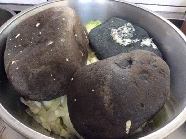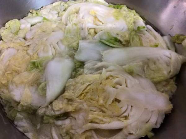 1、整顆大白菜洗淨後對切成一半,再一葉一葉抹上一層薄薄的鹽巴,再放入盆內用大石頭壓出水,當水淹過大白菜即可