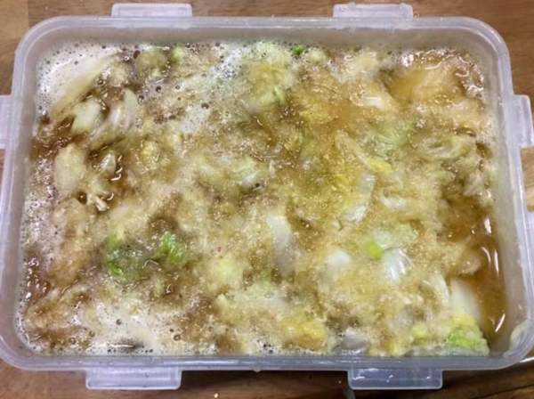 3、將瀝乾的白菜葉切塊後放入盒內,再將糖、鹽、醬油、蘋果泥、蘿蔔泥、韓式辣椒粉放入混合,再放入冰箱三、四天後可食用。