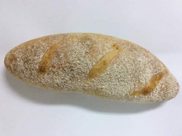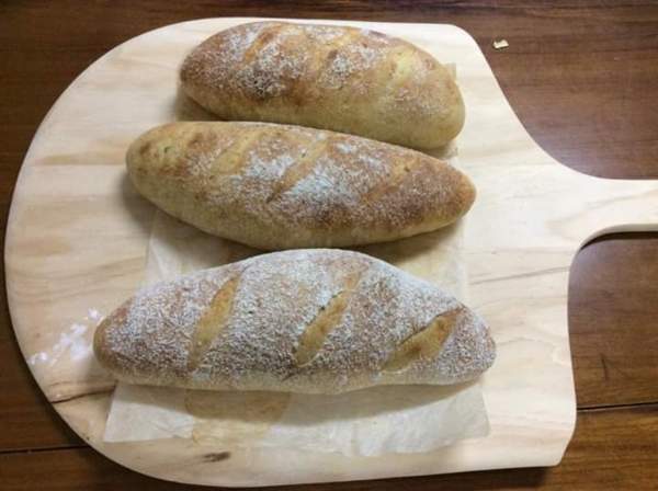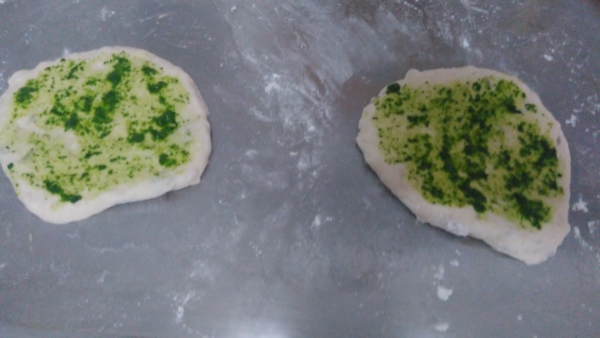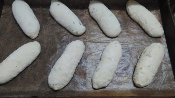 3、做將兩個圓型麵糰桿平,上面塗上巴西里香草醬,再疊起後捲成橢圓型。共可做成8個麵包,放置烤盤後將烤盤放入大型箱子裡,發酵一個半小時後(夏天可縮短成一小時),灑上麵粉再用刀片畫三道切橫後,進入烤箱烘烤25分鐘即可。上火250度、下火230度。