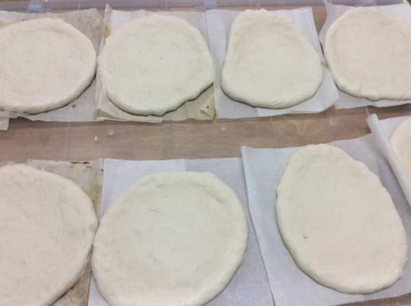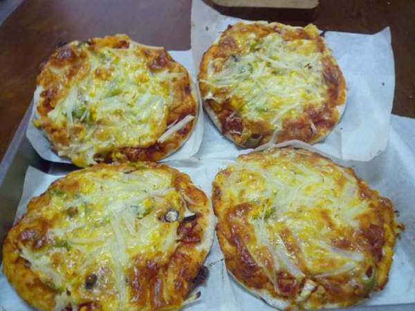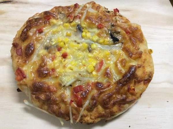 將麵糰打好後取出,放入保鮮盒內,存放冰箱冷藏,隔天發酵完成後取出切割成四等分搓圓。中間發酵20鐘後桿成餅狀,用手指按壓數洞後再發酵約一小時,依天氣不同略作調整,最後鋪上一層披薩番茄醬、起司絲、甜椒、杏鮑菇、玉米粒、馬鈴薯絲、鳳梨丁再灑上黑胡椒、九層塔。烤箱預熱上火250度,下火240度,烤25分鐘,即可取出。