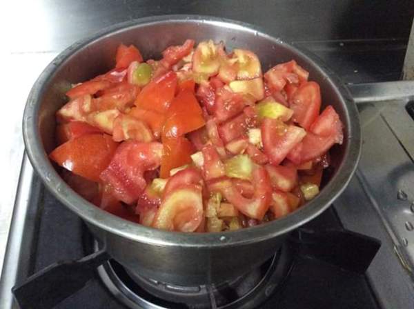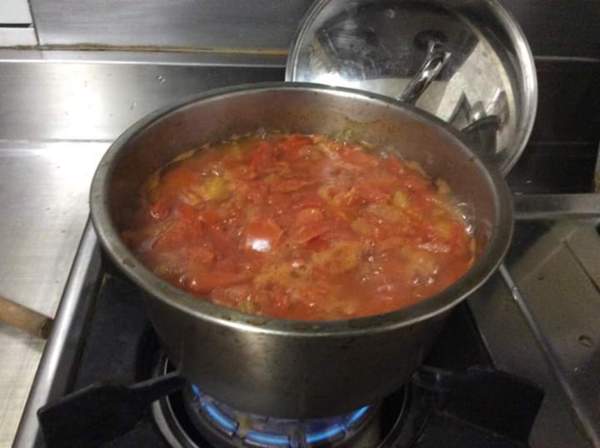 切碎番茄加蘑菇一起熬煮,縮水後加入番茄糊、義大利香料、黑胡椒粒、橄欖油