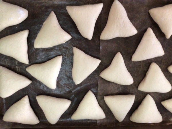 4、將小麵糰桿平加入內餡30克,包成三角形狀