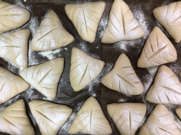 6、發好後噴水,灑上麵粉,再切成葉型