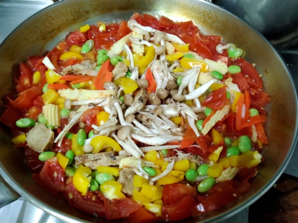 2、番茄、甜椒、玉米筍或玉米粒、紅蘿蔔、毛豆仁、筊白筍、綠花椰菜、猴頭菇、鴻禧菇