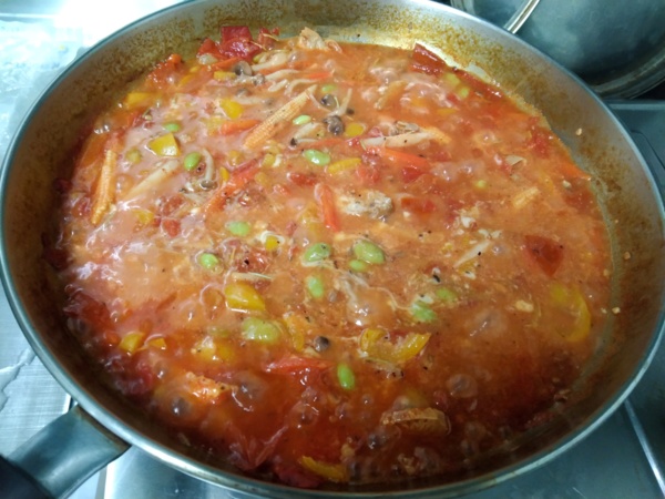 2、平底鍋放入適當的水依序加入番茄、紅蘿蔔、玉米筍、茭白筍、毛豆仁、猴頭菇,先煮一會兒,再加入甜椒、鴻禧菇煮熟,加入義大利香料、黑胡椒粒、番茄醬、起司絲煮滾,熄火再加入橄欖油,即完成義大利田園醬°綠花椰菜燙熟放在盛好的義大利麵旁邊,這個季節少綠化椰菜,就沒加入°