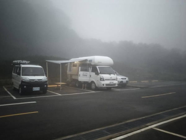 為了一償宿願,上週來到擎天崗,卻被滿滿的車陣嚇著,無法趨近。也因天色漸暗,山裡起濃霧,我們便順著陽金公路回程。在幾乎看不見山路中慢慢行駛,正遺憾無法看見周邊的山色,突然看見有人群聚集在一處,一眼望去,是一處停車場,景色也煞是好看。便駛往停車場,三層的停車空間,發現停了不少車子,正在閱覽景觀,有三輛露營車迎面駛來,就和他們聊起°發現這裡真是一處絕佳的駐點,外子提說下回就從這裡上磺溪走到擎天崗。