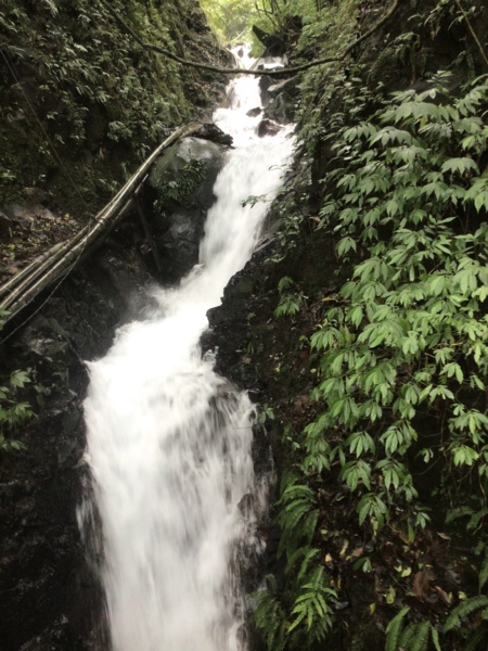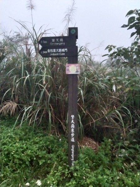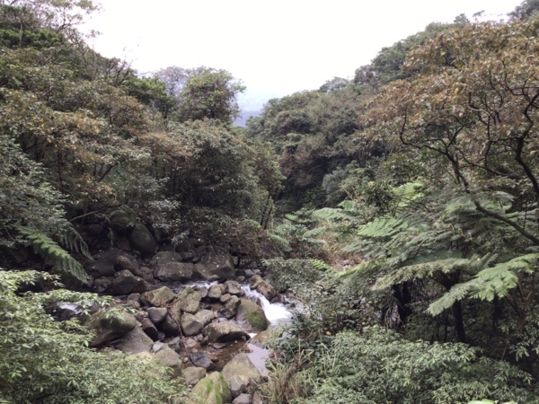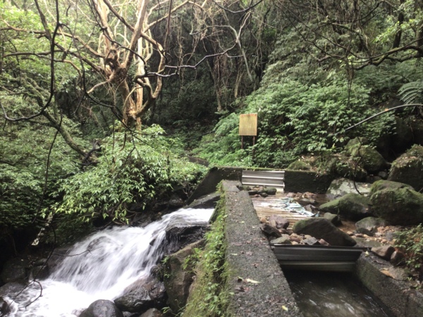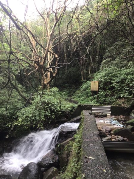所以我們再來到上磺溪,外子滿心期待這趟步道之旅,對我們來說,這是即將打開的新視野。看到指標,寫著到擎天3.5Km,心想這不是一條短途,何況走著是山路,但外子信心滿滿,卻不知道此刻的我體能有限。原想走到哪裡就算到哪裡,不用太在意,輕鬆走便是。拄著兩隻拐杖,慢慢而行,開始徒步,便發現,這可能不是一條輕鬆的步道,順著路徑慢慢走,看著一旁的溪流,期待著未知的風光°沒多久,看到層層的階梯,心想,若是一直往上坡,這路可不累著了°拾階而上,感覺過了好久,公里數卻只有一點進展°這時,對面走來的人群中,帶著兩隻白色貴賓狗°外子說妳看!狗都能走了,妳一定也沒問題啦!但看他們輕鬆的模樣,且跟我們說,兩隻狗都輕鬆走到,全程只要一小時半便可到達。沒多久,又看到帶著孩子走來的人群,外子又說,孩子都可以走了,妳沒問題的,好似我非走不可。
