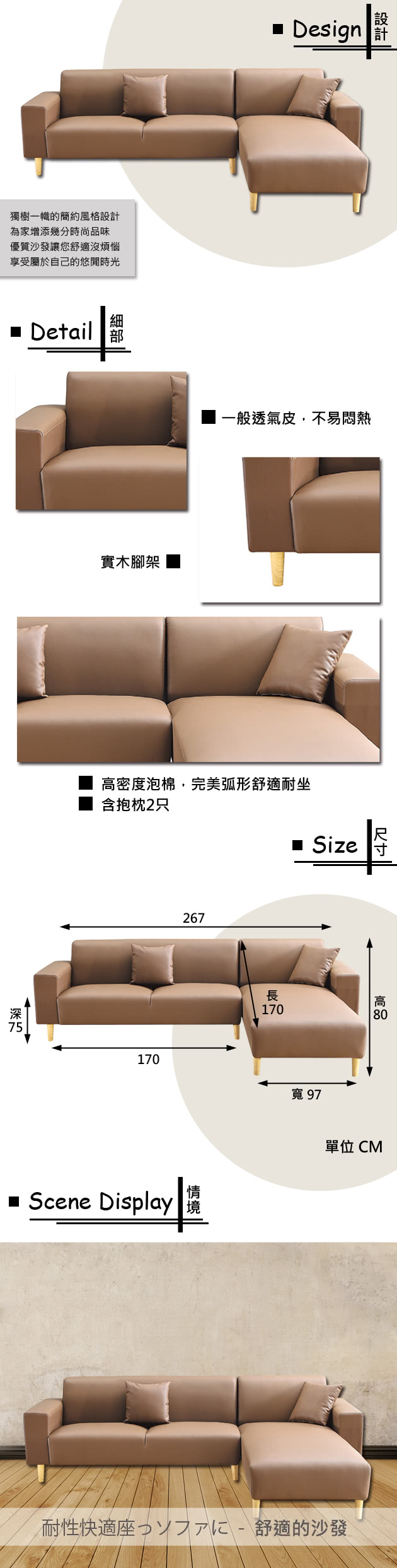 (如圖,網頁產品因電腦螢幕設定差異及拍攝關係請以實品顏色為準。 不含情境圖內之擺設飾品,尺寸標示皆有正負3?)設計即是生活!獨樹一幟的簡約風格設計,為家中角落增添幾分時尚品味,或躺或坐,舒適感讓您盡情釋放一身的疲累,暫且忘卻腦中煩雜的思絮,享受只屬於自己的悠閒時光。優質設計的沙發構思都是針對台灣各種乘坐習性來做改善,買到了品質也要買到設計,100?灣精心製造,頂級高彈力釋壓海綿,徹底支撐人體壓力,彈性佳超耐用,坐墊採用高密度泡棉坐感極佳不易塌陷、久坐也不易變形,舒適好沙發還不入手嗎!?◆此商品不需DIY組立,此商品為組立後之成品。?◆高密度泡棉,舒適耐座。?◆實木造型椅腳,完整的穩固性,並且兼具了整體沙發的美感與質感。?◆品質保證、專業設計、貼心服務。?◆全由專人配送到家,專業安心服務,替你省下更多時間。