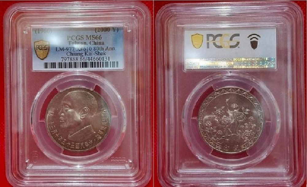 1966年(民國五十五年)蔣總統八秩華誕雙鶴 金幣PCGS MS65-46661120壹枚最新成 交價6600美元《牯嶺街知名幣商賣出,當時 台灣收藏者購買須支付7150美元(新台幣 232375元)...