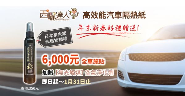 西曬達人感謝各位今年的愛護與支持! 即日起至2020年1月31日止 凡預約並施貼全車隔熱紙者 可獲贈日本新一代空氣淨化產品 【無光觸媒空氣淨化劑】一只 非傳統光催化光觸媒,在無光下可持續分解及淨化空氣...