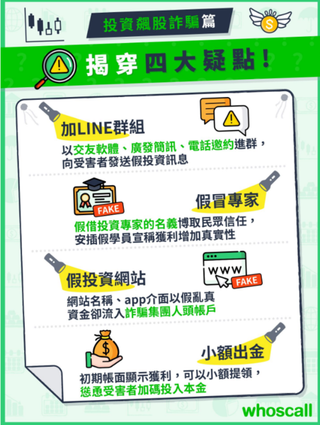 事實上,大部分網友遭詐的過程,就符合上述典型五步驟。要防範詐騙陷阱,第一步提高警覺至關重要,在網路上看到投資廣告或陌生網友投資訊息,標榜「保證獲利」「沒有風險」全是詐騙,只要第一步沒有失足,就不會出現後續財損。