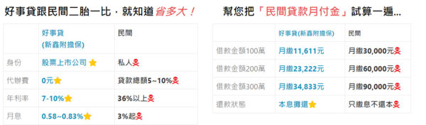 透過雙代(代書和代辦)申辦貸款也都是向融資公司申請,在裕融新鑫推出房貸商品之前,被銀行婉拒的人只能妥協去找民間借貸。但現在有好事貸二胎房貸,條件、規範、還款方式都比照銀行,是銀行之外的最佳選擇。好事貸幫您把「民間貸款試算貸款月付金」一遍,就知道省多大!