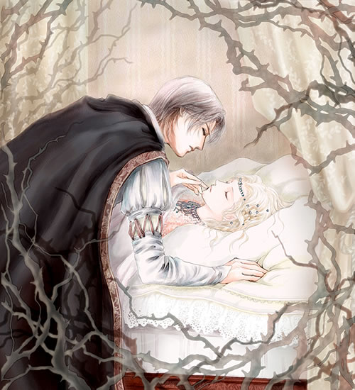 他怔然的望著滴落在手上的淚珠,沒想到自己還有眼淚....他的淚水不是早在千年前就已流乾?然而淚水就像是一發不可收拾似的,竟不斷地由他的眼眶迸出。他拼命說服自己,「她只是睡著了,她沒有死,她會再度甦醒的」,而事實也的確是如此,但他依舊無法制止淚水的滑落,也無法壓抑胸口不斷流洩而出的傷痛。