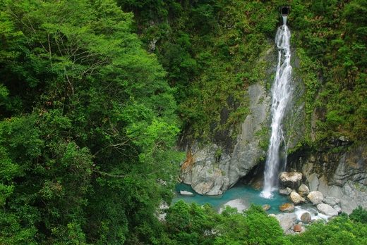 峭壁聳立,谿谷深邃,水色湛藍,岩壁經過溪水無數次沖蝕洗禮,顯露出來美麗的摺皺痕跡讓人驚豔驚,山瀑漫無止境從天頃洩轟轟作響激起水花四濺,空氣中飄滿了負離子,深深地吸一口氣感覺到它的鮮活沁入心扉,溶入在自然意境。