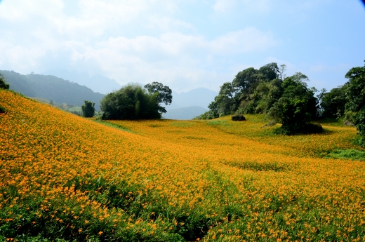 今日的氣候雖然陽光和煦,但穹蒼只有淡淡的藍色調,遠景抹上一層霧色。上天總是會打開另一扇窗,地面、山坡、山谷開滿盈千累萬,一朵朵黃澄色的小太陽,姹紫嫣紅,引人入勝,紛至沓來。