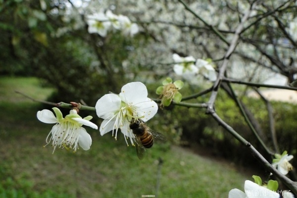 雪白花叢間,只見蜜蜂不停飛舞忙著採花蜜