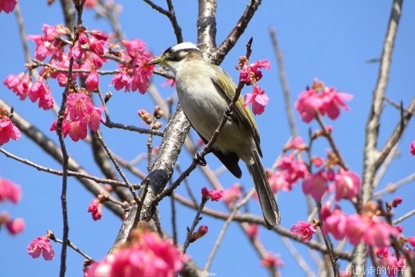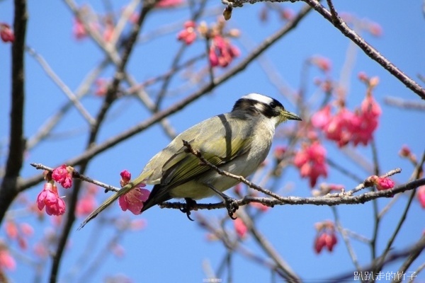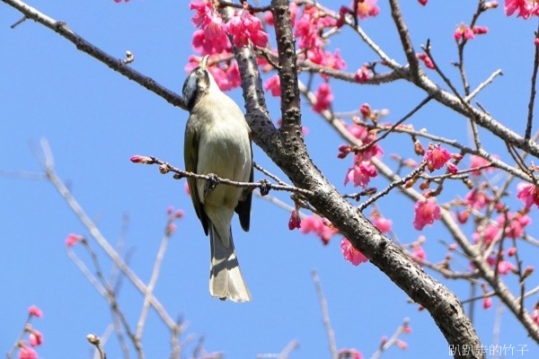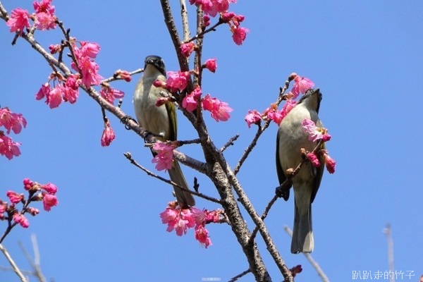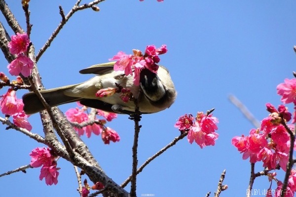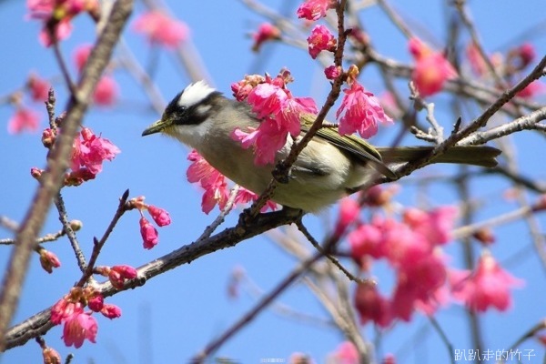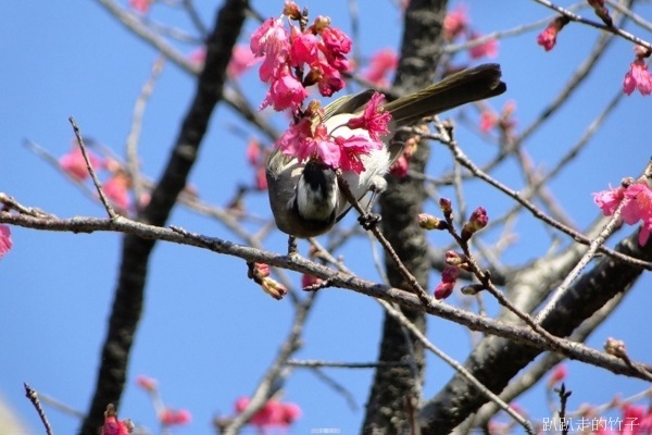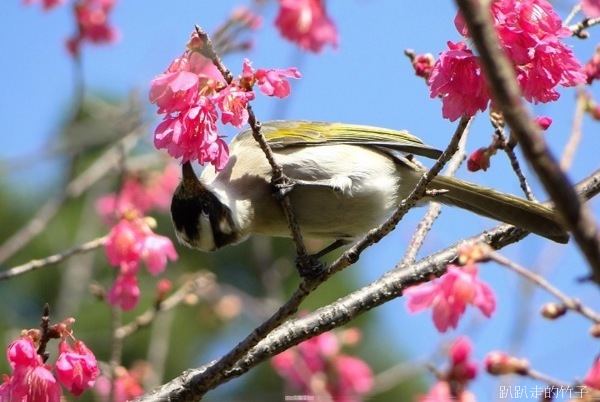 正當陶醉在冬末早開的櫻花樹下拍得忘我之際,突然聽到一陣嘈雜聲,樹梢飛來了幾隻鳥兒在花叢間覓食,原先以為是「小綠綠」綠繡眼,仔細一看,原來是俗稱「白頭殼仔」的白頭翁,竹子怎可失去這大好機會,抓緊相機、仰著脖子就是一陣亂拍,只是這些白頭殼仔哪肯乖乖停在枝頭讓你拍,不停的飛上飛下,大約拍了近百張,不過失敗的居多。