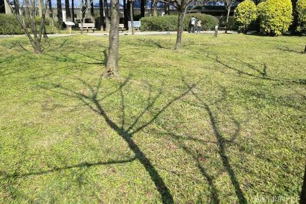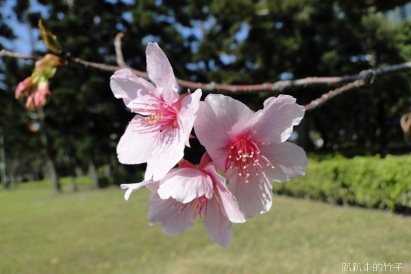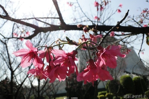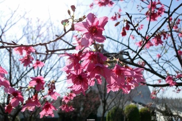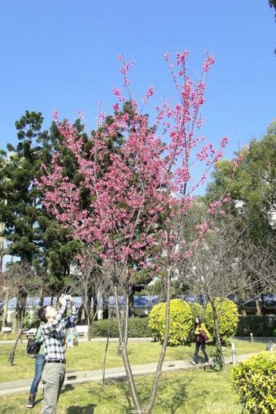 仰頭拍得脖子酸,一看腕錶已近1點半,該回去上班了,只好意猶未盡倖倖然的走開。回程的路上看到大堂前面草坪上的「河津櫻」,光禿禿的樹枝上已開了幾朵粉紅色花,看來,春天的腳步真的近了。