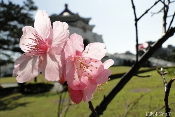 信義路大忠門進來左邊,大堂主體旁的草地上是山櫻花最密集的地點,目前花況參差,大部份都還沒開,但有幾棵已迫及待的綻放了,路過的行人、遊客看到美麗的櫻花,也紛紛拿出相機手機來拍。