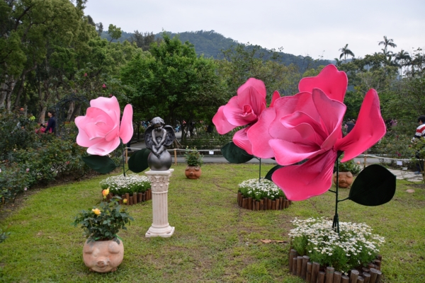 今年玫瑰展的主角~仿玫瑰造型的特大朵假花非常醒目,樹立在草坪上