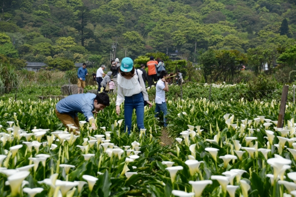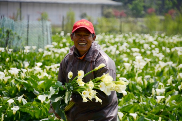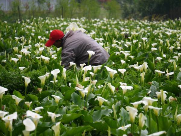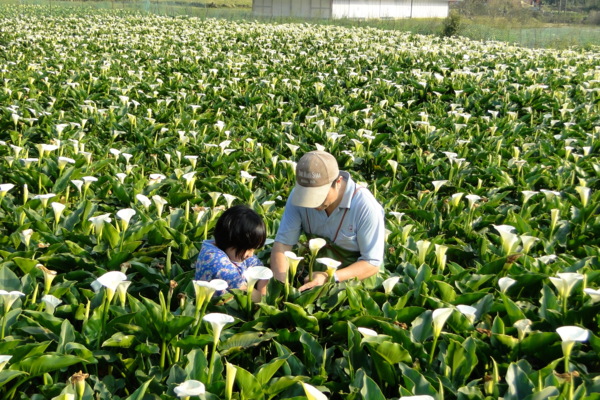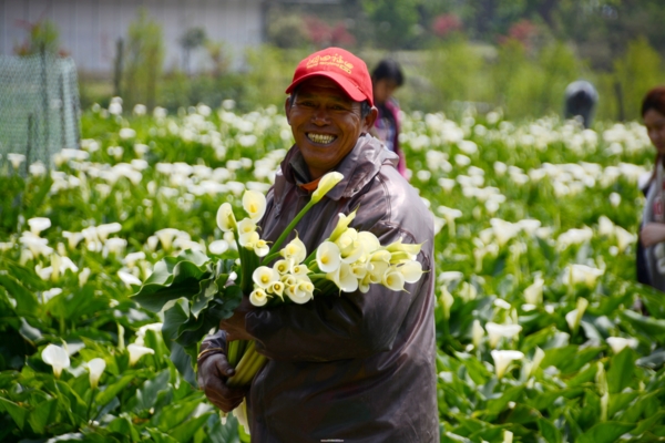 看到海芋田裡一位淳樸的花農辛勤熟練的採著花,不一會功夫手上已是滿滿一大把白色海芋,他快步的走回入口處,原來他就是這處海芋田的老板。