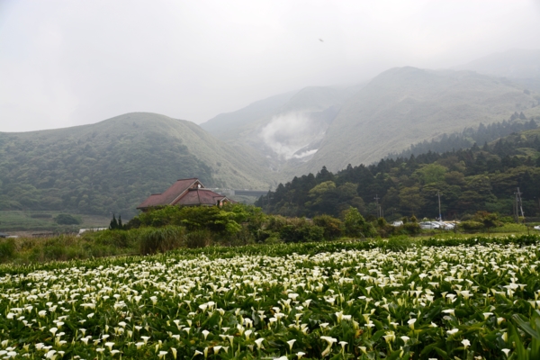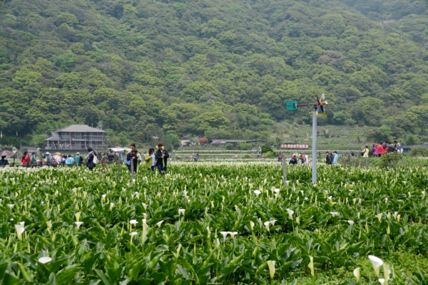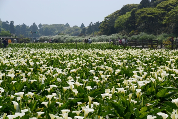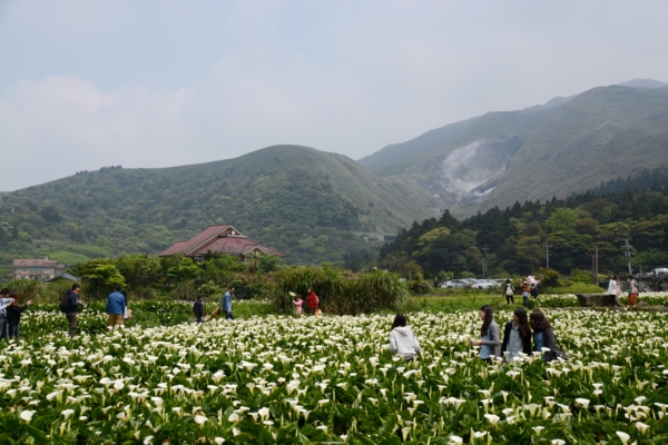 竹子湖賞海芋有2個地點,過了湖田國小的叉路口,右轉是「頂湖」~隱藏在山凹裡有著大片的海芋田、左轉是小巴公車有到的以園藝造景取勝商家較多的「水尾」海芋大道。我比較喜歡頂湖四面環山寬闊的田園景觀,背景的七星山和小油坑裊裊上升的硫磺霧氣,更襯托出海芋的潔白無暇,一大片雪白的花朵隨風搖曳,讓賞花人個個笑逐顏開。