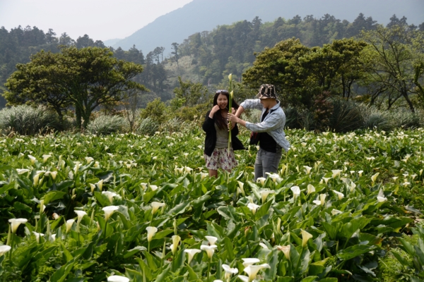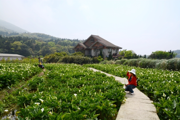 也許是清明節的關係,竹子湖的遊客並沒有預期的多,11點多我們來到頂湖小鎮,先停好了車子,跟老板約好一個鐘頭後再來用餐,於是我們開開心心的走下花田去賞海芋、拍海芋了。