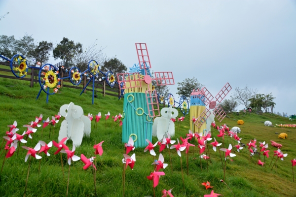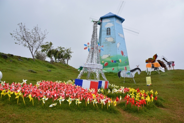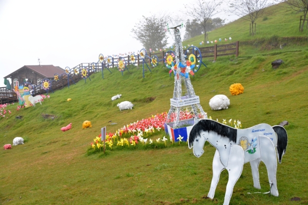 觀山牧場區是此次風車節的主要場地之一,草地上佈置了各式各樣五顏六色的彩繪風車,搭配草原綿羊、牛、馬和花卉造景,還有商家提供的巴黎鐵塔裝置藝術等,讓整個展區變得繽紛浪漫,想必是遊客們爭相拍照的地點。