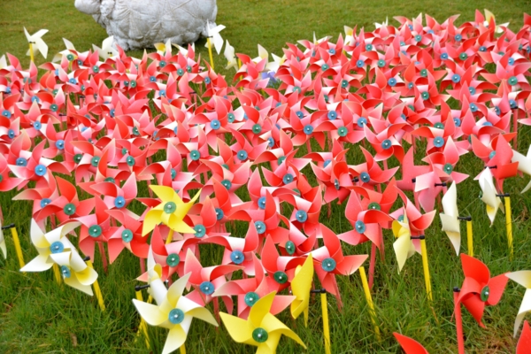 記得小學時候美勞課老師教我們用色紙做風車,完成後再用鐵絲固定在竹簽上,輕輕一吹或撥動風車就轉動了,迎著風跑,風車轉動的速度就更快,在那個物質缺乏的年代,一支小小的風車就是小孩子最喜歡的玩具了,大家普遍沒錢買彩色紙,就把用過的作業簿撕下來做風車,那隨風轉動的薄薄葉扇,蘊藏了多少小小腦袋瓜的天真幻想。長大後,風車的造型更多也更為多彩多姿了,最愛在海邊看著高大的風車轉呀轉的,我的思緒和煩惱也跟著飛到藍天去了,而兒時的夢想呢?