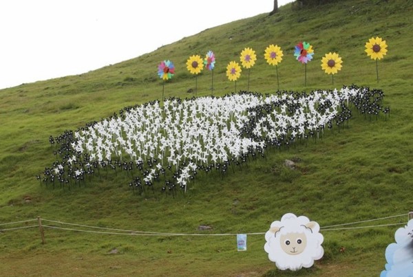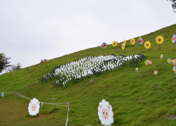 看得出來這個造景是什麼嗎?我拍了好多個角度,遠景、近景,回來在電腦上看,原來是一隻黑白相間綿羊圖案的造型風車地景藝術,你看出來了嗎?