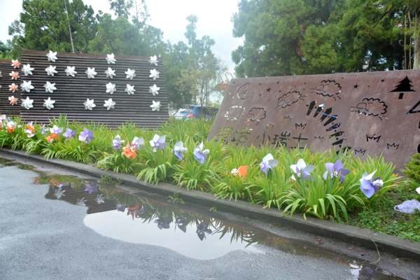離開青青草原進入觀山牧場區,入口掛著幾支造型簡單的藍白風車,雖然還沾著雨珠,但仍然引起我的注意。