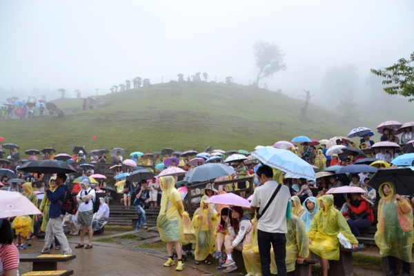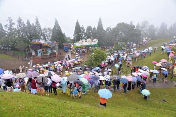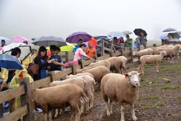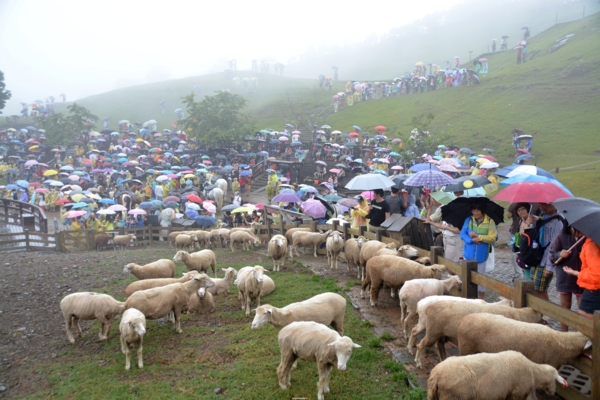 車子到了清境已是午後2點多,也許是受到太平洋上颱風外圍環流的影響,青青草原上飄起了忽大忽小的雨勢,但仍然不減遊客們的遊興,2點半的綿羊秀即將登場,現場已是滿滿的觀眾,因為是暑假的關係,全家大小一起來旅遊渡假的不在少數,遊客們或坐或站、或穿上雨衣或撐著傘,五顏六色的花傘使得草原成了一片美麗的傘海。