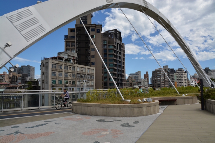 風景優美的跨堤平台,一邊供用路人行走,一邊是自行車專用道,不僅串連客家文化主題公園、古亭河濱公園,也可搭配自來水園區、公館水岸廣場等休閒遊憩設施,讓民眾輕鬆享受往來市區及河濱的休閒生活。