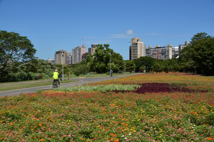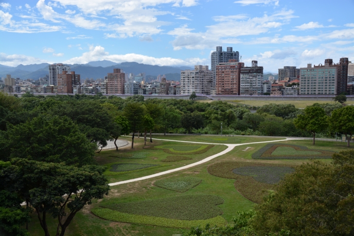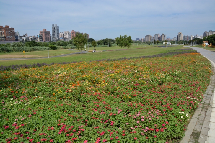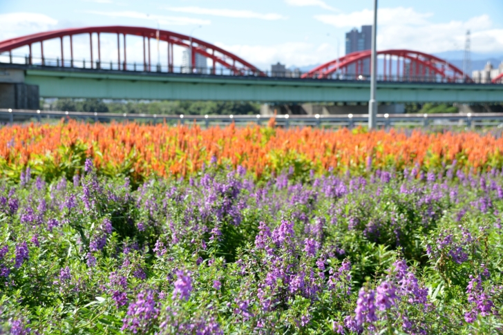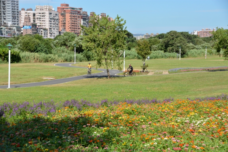 在跨堤平台俯瞰古亭河濱公園的花海景觀