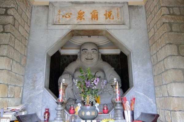 雨似乎沒有減緩的樣子,我們只好沿著階梯走下來到圓通寺,耳邊傳來陣陣和詳的誦經聲,頓時讓我煩燥的心也沈澱了下來,在正殿前雙手合十向佛祖虔誠頂禮,寺前階梯上方供奉著彌勒佛,永遠以一副笑臉歡迎香客的到來。